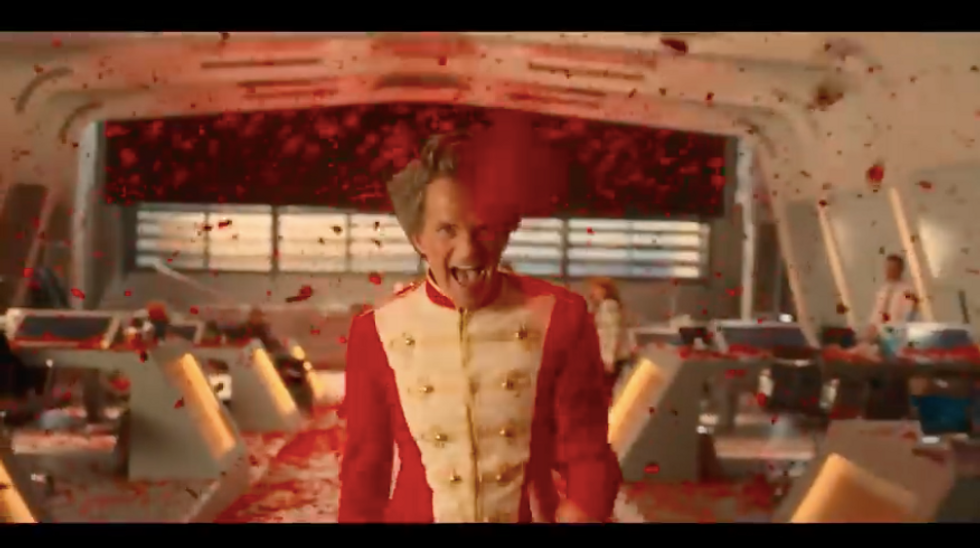 Dans la bande-annonce, nous voyons Harris porter un smoking noir et un haut-de-forme et plus tard dans un costume de tambour-major rouge et blanc alors qu’il lance de façon spectaculaire des pédales de roses. Faut-il en dire plus ?