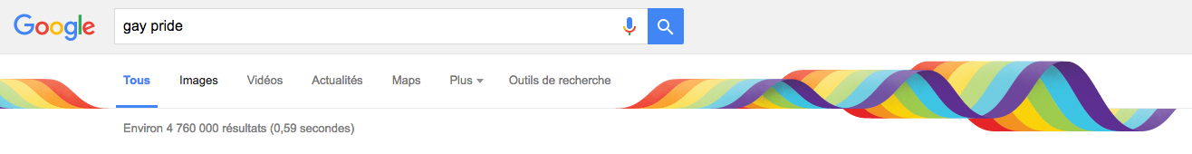 Ainsi, quand on marque sur Google les mots clés « Gay Pride », le moteur de recherche affiche le drapeau de la communauté LGBT. Un beau petit clin d’oeil pour un mot aux couleurs de l’arc-en-ciel. Bien entendu, les sites qui ont un bon référencement web, se verront plus proche du drapeau!