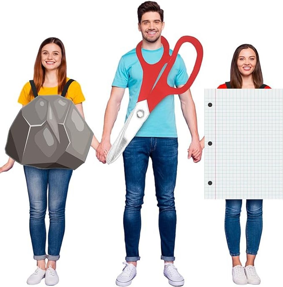 Parfait pour les groupes d’amis de trois personnes, le costume Pierre Papier Ciseaux permet à chaque membre du groupe de se déguiser comme l’une des options de jeu de mains les plus populaires. Choisirez-vous la pierre, le papier ou les ciseaux pour votre stratégie ? Un grand jeu entre amis, ce costume représente le plaisir que les amis ont lorsqu’ils se réunissent et jouent.