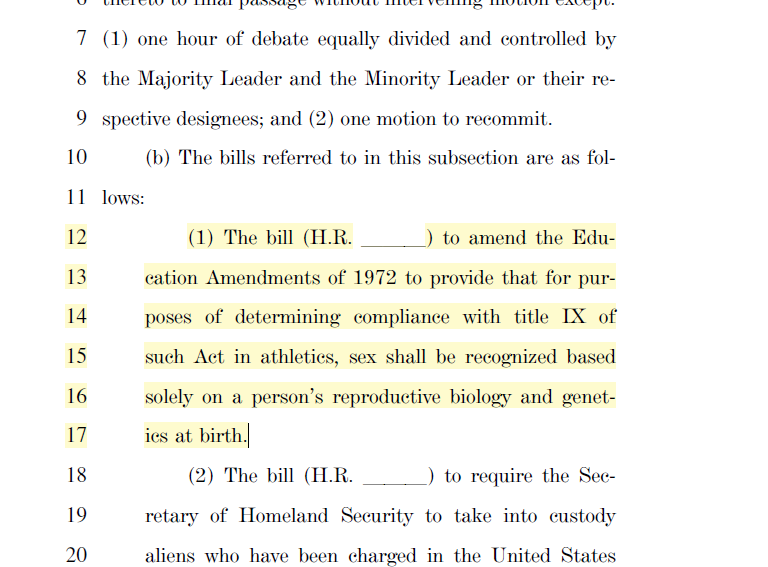 Rapportée pour la première fois par la journaliste transgenre indépendante Mady Castigan, la disposition précise que la conformité au Titre IX en athlétisme serait déterminée par le « sexe biologique ». Notamment, le projet de loi ne définit pas le « sexe biologique ». Les propositions républicaines précédentes ont défini le terme d’une manière qui exclut non seulement les personnes transgenres mais également les personnes intersexuées. On ne sait toujours pas si ce projet de loi étendrait sa redéfinition du sexe au-delà de l’athlétisme pour englober tous les aspects du Titre IX. Si tel est le cas, les conséquences pourraient être considérables, affectant potentiellement l'accès des personnes transgenres aux toilettes, aux vestiaires et à la protection dans les cas de discrimination à l'échelle nationale.