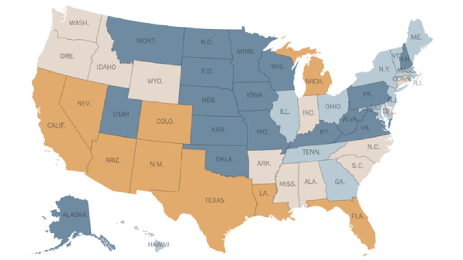 Les 19 États sont l’Alabama, l’Arkansas, l’Arizona, la Californie, le Delaware, la Floride, la Géorgie, l’Iowa, l’Idaho, le Kansas, la Louisiane, le Mississippi, le Nevada, la Caroline du Nord, l’Oklahoma, la Caroline du Sud, le Tennessee, le Texas et l’Utah.