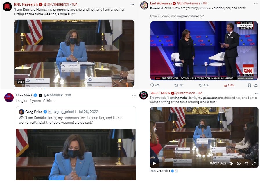 Quelques instants plus tard, plusieurs comptes de droite ont publié la même vidéo de 2022 : une vidéo de la vice-présidente Harris assise à une table et s'adressant à un groupe de personnes, où elle se présente en énumérant ses pronoms et en décrivant ses vêtements. Elle dit : « Bonjour, je tiens à souhaiter la bienvenue à ces dirigeants pour être venus et avoir cette discussion très importante sur certains des problèmes les plus urgents de notre époque. Je suis Kamala Harris, mes pronoms sont elle et elle, et je suis une femme assise à la table portant un costume bleu.