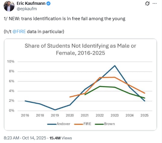 Mardi, Kaufman a publié un fil de discussion sur Twitter déclarant que « l’identification trans est en chute libre chez les jeunes ». Le graphique qu’il a utilisé pour le prouver était cependant fondamentalement erroné : il montrait des étudiants qui s’identifiaient comme « ni homme ni femme », une catégorie qui exclut la plupart des hommes et femmes transgenres. En d’autres termes, la prétendue preuve par Kaufmann d’un effondrement de « l’identification trans » était en réalité un tableau sélectif d’étudiants non binaires, et non de personnes transgenres dans leur ensemble. La distinction n’avait pas d’importance pour la chambre d’écho d’extrême droite. Matt Walsh s'est emparé de cette affirmation en se vantant : « Le transgenre est effectivement terminé. Nous l'avons détruit », tandis qu'Elon Musk a republié le graphique à ses centaines de millions de followers, remerciant personnellement Walsh d'avoir « joué un rôle majeur » dans la soi-disant victoire.