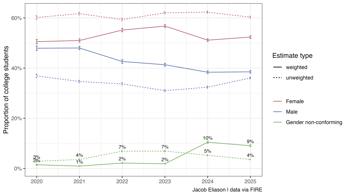 L'erreur ne s'est pas arrêtée là. Les chercheurs ont rapidement découvert que le graphique de Kaufmann, basé sur les données de la Foundation for Individual Rights and Expression (FIRE), une organisation de droite (Fire conteste cette caractérisation | qui étudie le discours sur les campus), contenait une erreur méthodologique fondamentale. Le data scientist Jacob Eliason a été le premier à le repérer : Kaufmann avait effectué son analyse en utilisant le brut réponses à l’enquête plutôt que d’appliquer la pondération fournie par FIRE pour rendre les résultats représentatifs à l’échelle nationale. Sans pondération, les données ont considérablement déformé la population et créé l’illusion d’une baisse là où il n’y en avait pas. Lorsqu'Eliason a réexaminé les chiffres correctement, la ligne de tendance s'est complètement inversée, montrant que la proportion d'étudiants ne s'identifiant ni comme hommes ni comme femmes n'avait augmentépas diminué. En d’autres termes, l’analyse de Kaufmann n’a pas révélé de changement culturel : elle a plutôt révélé une mauvaise pratique statistique.